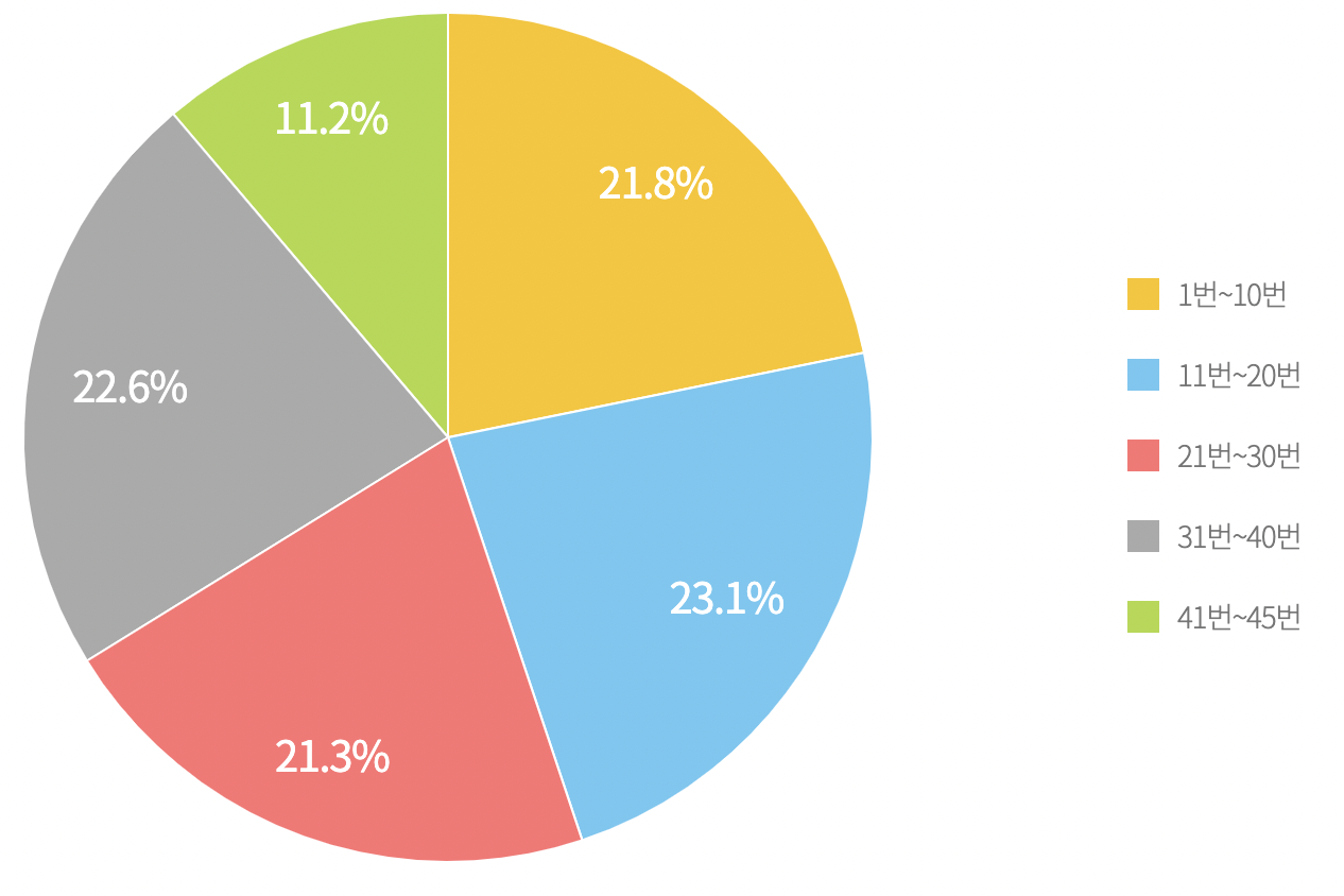이 역시 오래 반복하면 확률상 거의 비슷한 비율로 등장한다는 것에 근거해서 예측 번호를 만들어 볼 수 있겠네요.