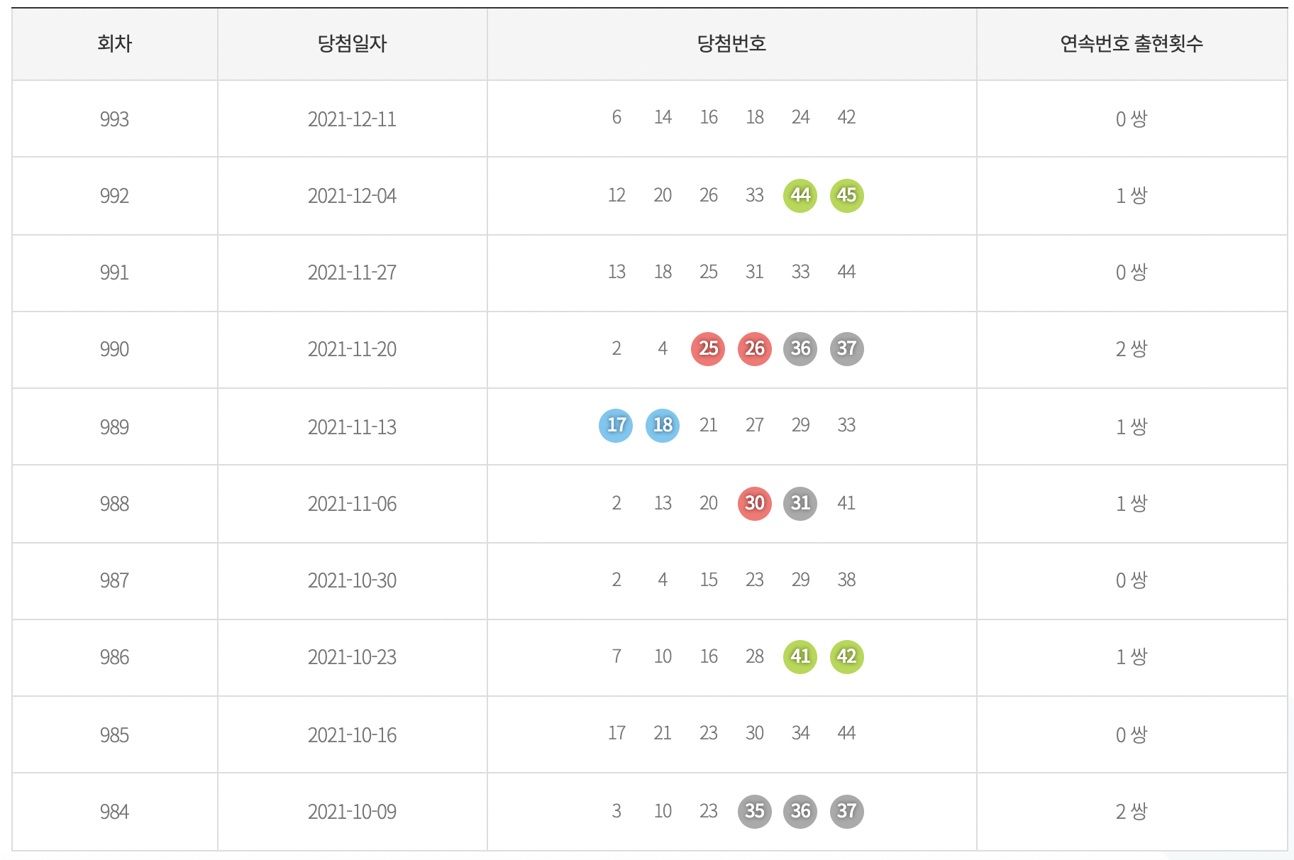 로또 당첨번호에 포함된 연속번호 출현 통계