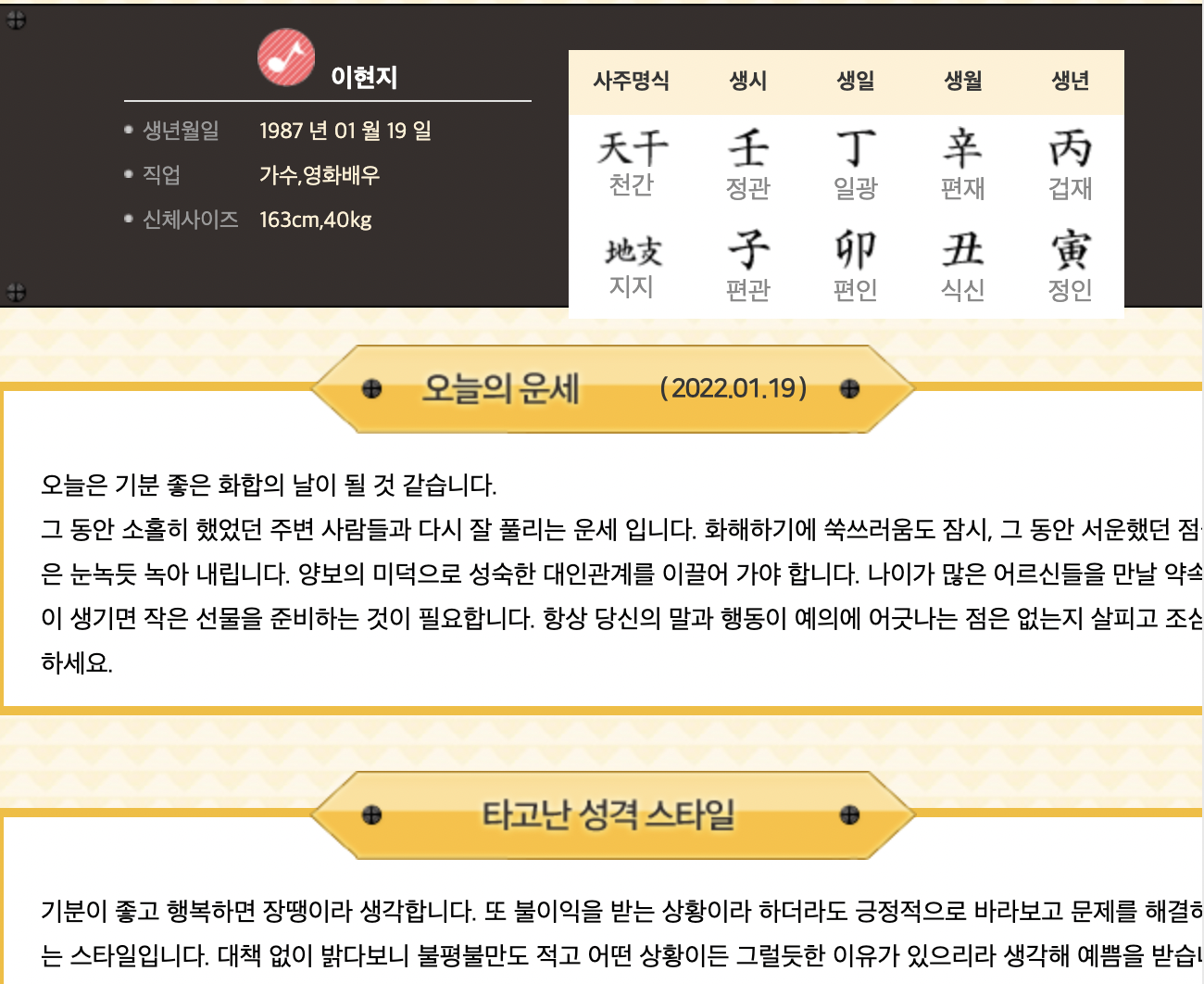 가수이자 영화배우인 이현지 씨의 운세를 클릭해보니 아래와 같이 오늘의 운세와 타고난 성격 스타일을 볼 수 있었습니다.