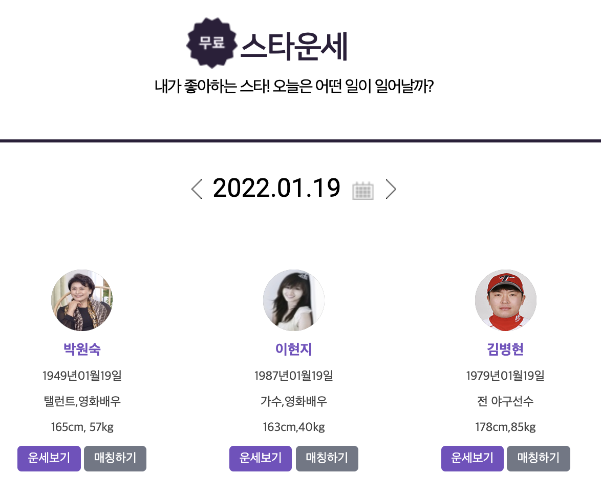 오늘 태어난 스타의 운세도 무료로 볼 수 있습니다. 스타의 생일을 안다면 날짜만 변경하면 볼 수 있으니 참고하세요.