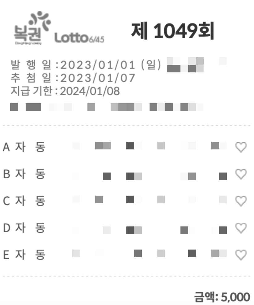 그리고 로또 5개를 5천원에 랜덤 구매했습니다.