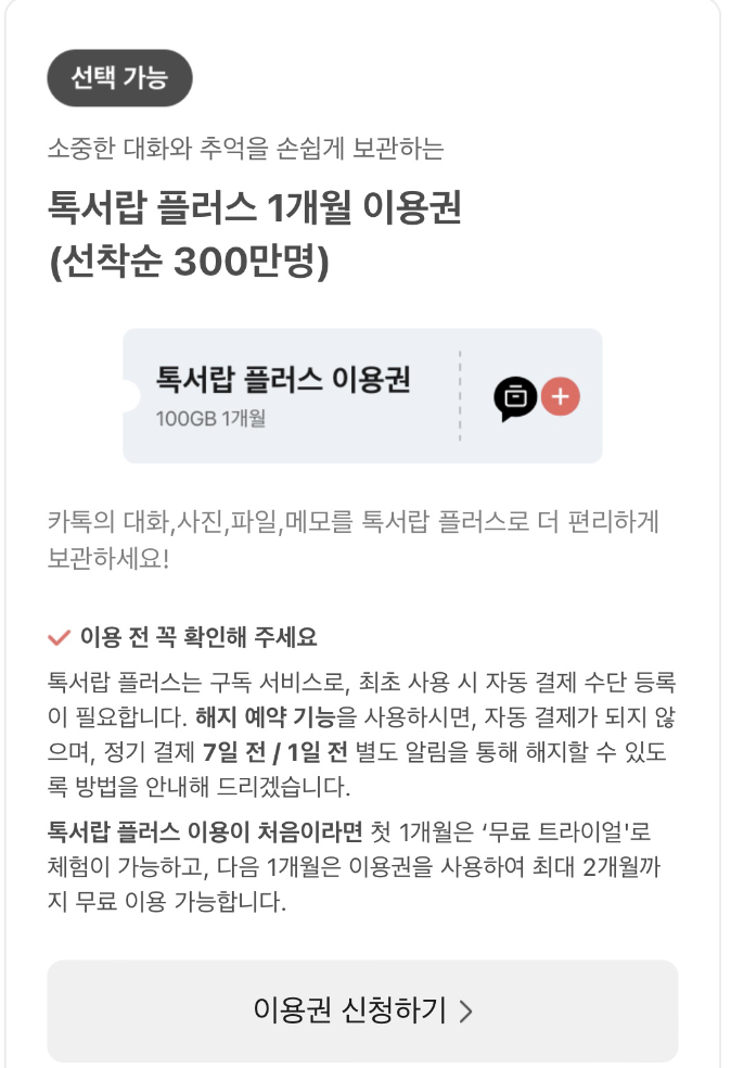 그리고 그 아래에 "톡서랍 플러스 이용권"도 선착순 300만 명에게 지급되니 받아두면 좋습니다.