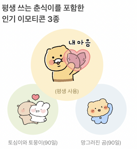평생사용 가능한 춘식이와 90일간 사용 가능한 토심이와 토뭉이, 그리고 망그러진 곰을 줍니다.